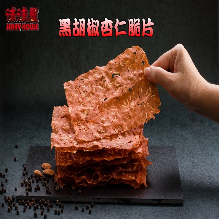 味味屋香酥杏仁脆片系列選用上等新鮮豬後腿肉再加上獨家醬汁及精細的製作,每一片薄度都很薄,一不小心就會破碎,所以必須人工烘烤照看,溫度太高太低也都會影響美味度,必須拿捏得剛剛好,因此製作的過程非常繁雜和耗時,但味味屋肉干堅持美味的品質是不變的,烤出來的脆片色澤和脆度都經過嚴格把關,將最好的脆片呈現給消費者,如果沒有吃過香脆的肉干可以來嚐試,保證一吃就會上癮!